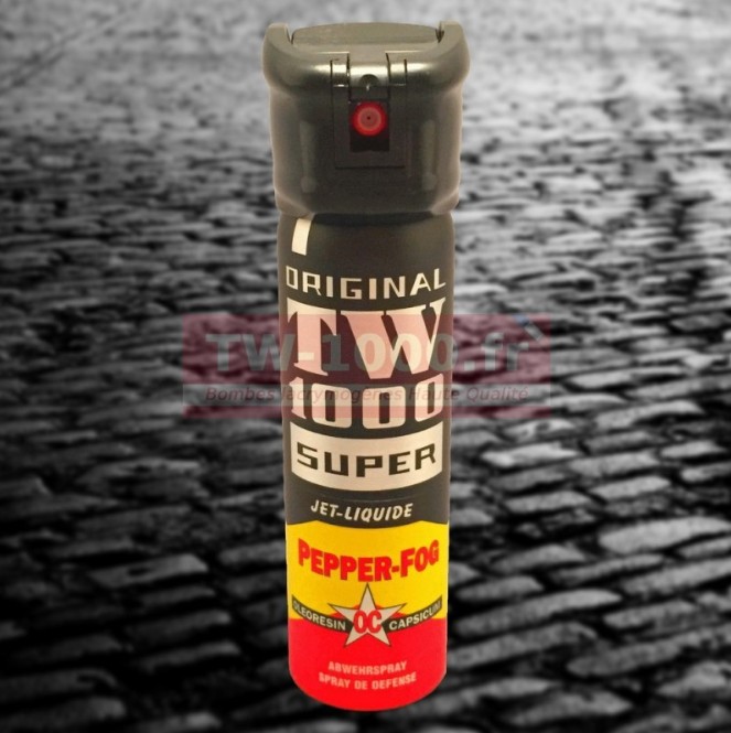 Bombe lacrymogène TW 1000 Pepper-Jet avec une projection de jet liquide au poivre.