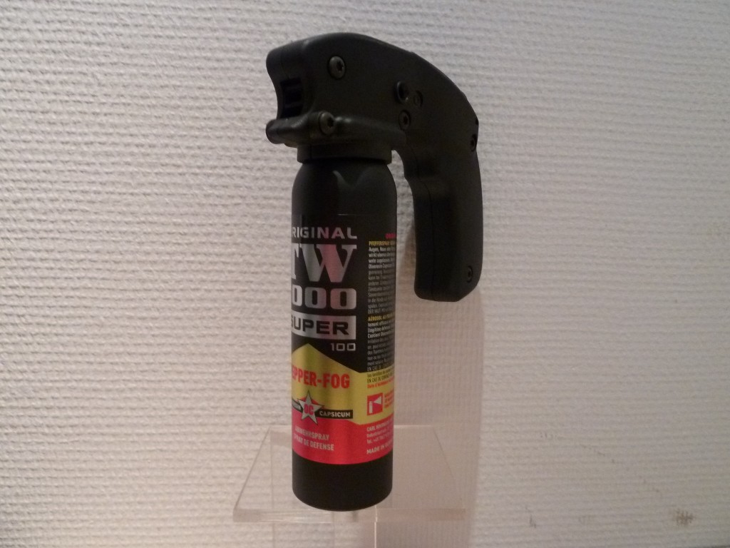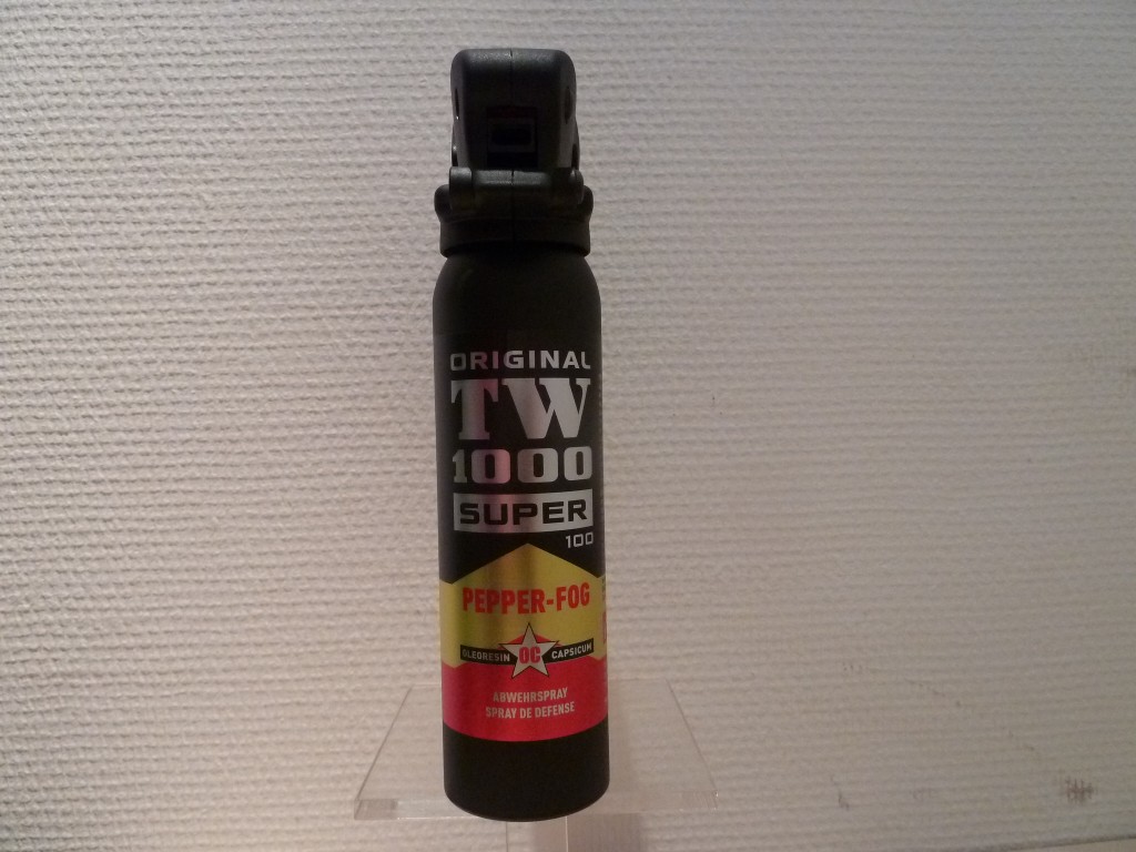 Bombe lacrymogène TW 1000 Pepper-Fog avec une projection de gaz au poivre.