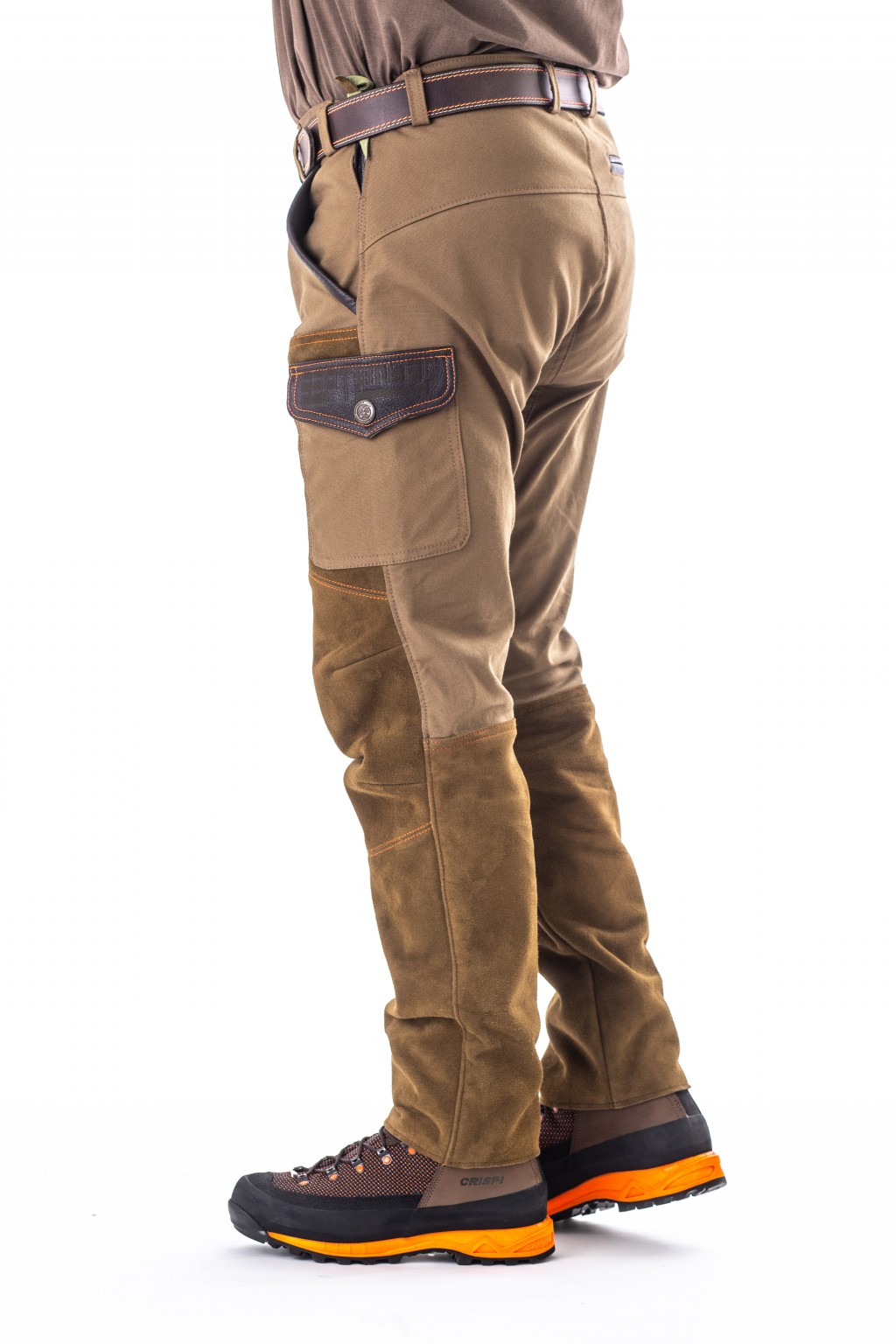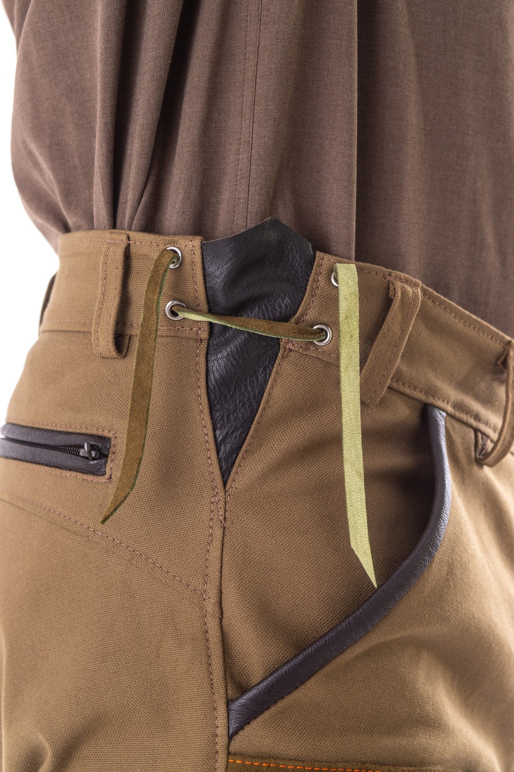 Pantalon en Toile Coton Lycra, renforts en cuir de Cerf avec surpiqures fil Orange.